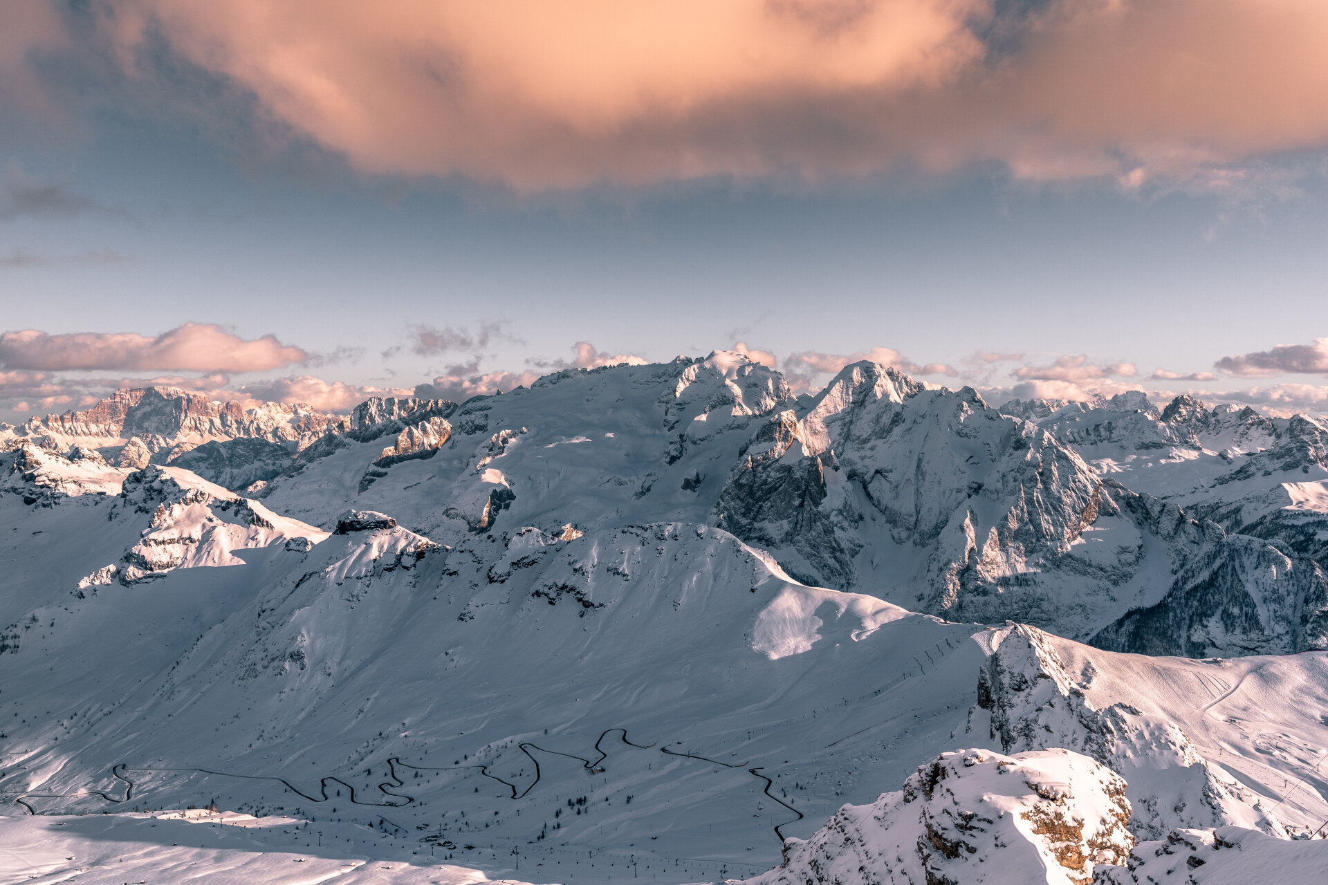 From Canazei skiers can reach "Pecol" by lifts and then catch the "Toè" gondola or the "Col dei Rossi" cable car. By following the "Kristiania" slope you get to the departure of "Sass Becé" chairlift and then over to Arabba. The "Maria" chairlift carries you up to Pordoi Pass. From here catch the panoramic cable car and get to the top of Sass Pordoi, better known as The terrace of Dolomites, at an altitude of 2,950 m. Return to the pass by cable car and ski along the "Pordoi" slope. Take the ski lift "Gonzaga" and ski down to "Pecol", right where you started the tour.